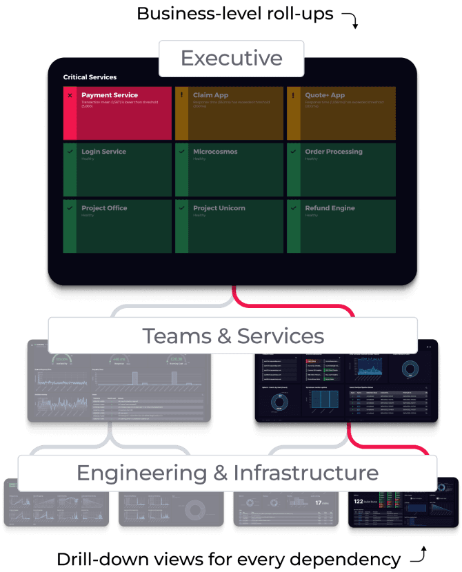 It's easy to get lost in the noise. SquaredUp's unique roll-up architecture gives individual teams ownership over their tools and data, while providing status and KPIs to management and stakeholders.