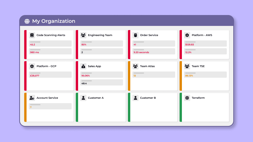 Say a monitor fails on one of your tiles. That failure doesn't just sit there, it ‘rolls up’ from the tile to the dashboard, and then to the workspace itself. So when you land on your organization home page, you're not just looking at a sea of alerts. You're looking at the health of every team, every service, every app, and all the monitors, KPIs, and data sources tied to that context.