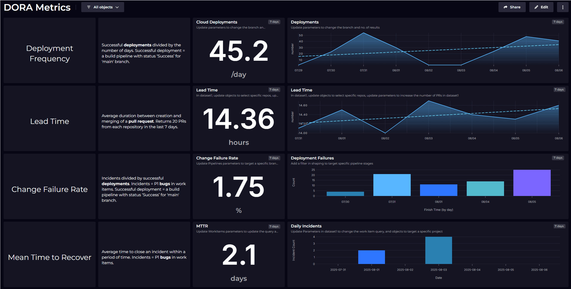 Our management team wants to see a summary of SLOs across all of our microservices, without getting into the nitty-gritty details of AWS metrics. For this we need to publish the SLO as a KPI. We use the term KPI (Key Performance Indicator) in the SquaredUp because this feature isn’t limited to SLOs, we can take the same approach for other KPIs such as cost, DORA metrics and project status.