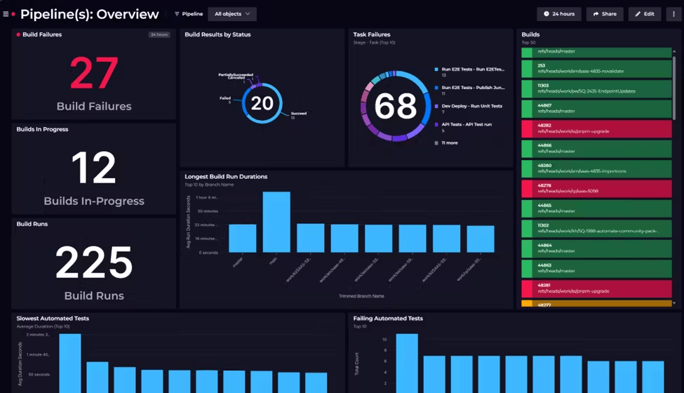 A drawback of using multiple tools in the CI/CD process is that monitoring the process requires you to log into each tool, which can be annoying and time consuming. But there’s a huge benefit to being a company that creates a product for monitoring – SquaredUp dashboards.